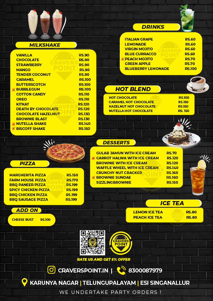 Welcome to Cravers Point, a charming café nestled on Siruvani Main Rd in Karunya Nagar, Tamil Nadu. This vibrant spot is quickly gaining a reputation for its exceptional culinary offerings. The menu boasts an impressive range of beverages, including smooth Iced Coffees—from classic Irish to trendy Iced Lattes. The Mojito selection, featuring flavors like Peach and Blue Curacao, is perfect for refreshing your palate.